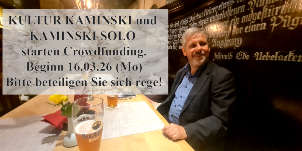Längst aber pocht das Finanzamt an meine Tür: KAMINSKI SOLO und KULTUR KAMINSKI müssen – sie MÜSSEN – Einnahmen erzielen. Anderenfalls droht die Herabstufung von KULTUR KAMINSKI und KAMINSKI SOLO zur bloßen Liebhaberei. Das wäre das Ende von Magazin und Podcast.